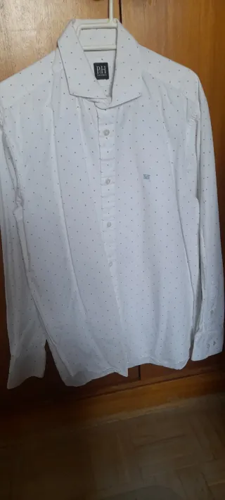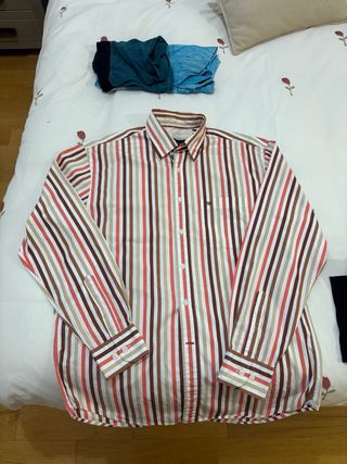 Conjunto de 10 camisas Pedro del Hierro (una de Mango), talla XL. Precio conjunto 120 euros, precios individuales ver más abajo. - Distintos colores, a rayas o estampados finos. - Todas de vestir, menos una con cuello Mao, 3 de ellas non-iron. - 7 con etiqueta, 1 sin etiqueta pero sin estrenar, y 2 con literalmente 1 uso. Precio para el conjunto completo. Por separado: - PdH non-iron 18 euros cada una. - PdH normales 15 euros cada una. - Mango y camisa blanca PdH usadas 10 euros cada una. Hago precio a partir de 3 camisas, hablamos por chat.