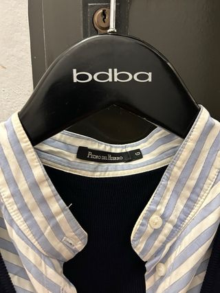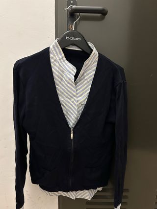 Conjunto de camisa y cárdigan de la marca Pedro del Hierro. - Camisa de rayas azules y blancas. - Cárdigan azul marino con cremallera delantera. - Bolsillos frontales en el cárdigan.