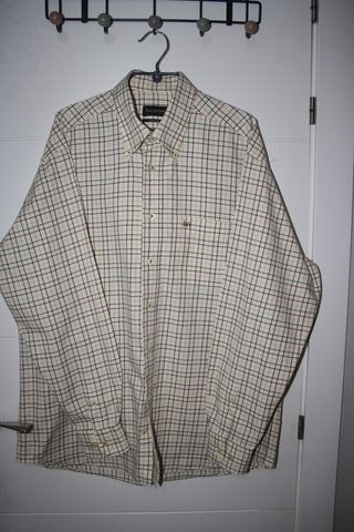 Camisa de vestir con un diseño de rayas finas en tonos marrones y azules. Confeccionada en algodón extrafino. - Cuello blanco. - Cierre de botones. En muy buen estado.