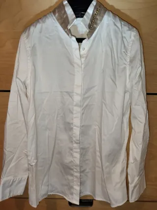 Elegante camisa blanca de Roberto Verino con detalles dorados en el cuello. - Cuello con acabado satinado y adornos. - Cierre de botones. - Manga larga.