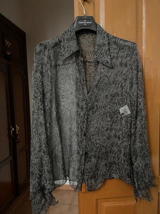 Elegante camisa de seda con un estampado único. - Diseño de cuadritos blancos sobre fondo negro. - Cuello camisero clásico. - Cierre de botones. Es la talla 36, S. Está nueva sin usar