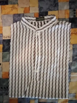 Camisa de vestir con cuello mao de la marca Roberto Verino. - Diseño de rayas verticales en blanco y negro. - Cierre de botones en la parte frontal.