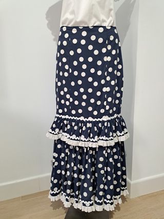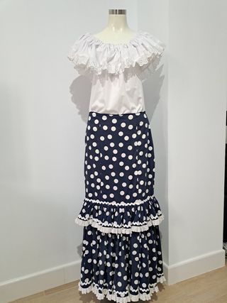 Falda Flamenca con camisa en perfecto estado tanto la falda como la camisa. La falda es elástica por lo que da desde una talla 36-38 a una 40- 42 perfectamente. lógicamente con posibilidad de arreglo a su medida. muy cuidada, ningún desperfecto.