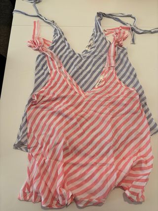 Conjunto de dos camisas de la marca DODO con un diseño de rayas verticales. - Una camisa es de rayas rojas y blancas. - La otra camisa es de rayas azules y blancas. - Ambas son de talla S y tienen tirantes con lazada.