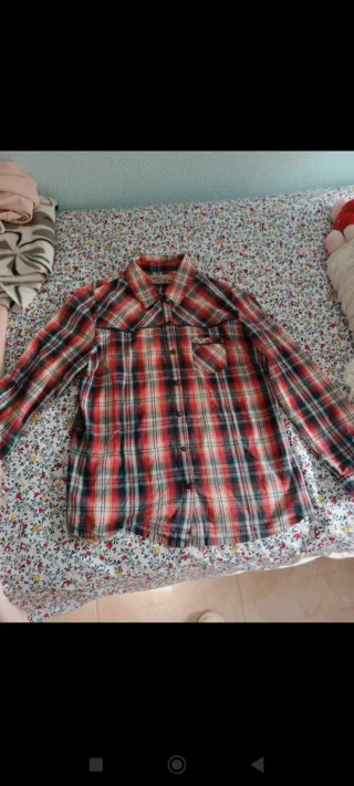 Camisa de mujer con estampado de cuadros, manga corta, buen estado y talla 36. Tiene una pequeña mancha que no he quitado. Recomiendo lavar y planchar todas las prendas. Cualquier pregunta, aquí estoy ^^