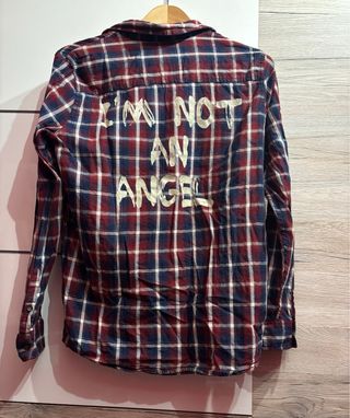 Camisa de cuadros con estampado llamativo en la espalda. - Diseño de cuadros en tonos azul y rojo. - Estampado I'm not an angel en blanco. Talla S, pero es amplia y se puede utilizar como sobre camisa también. Es preciosa