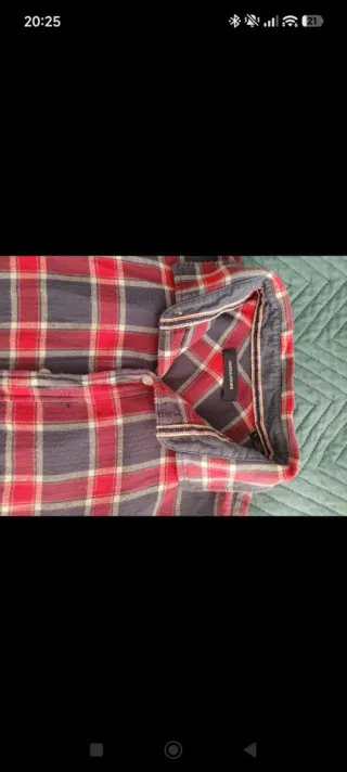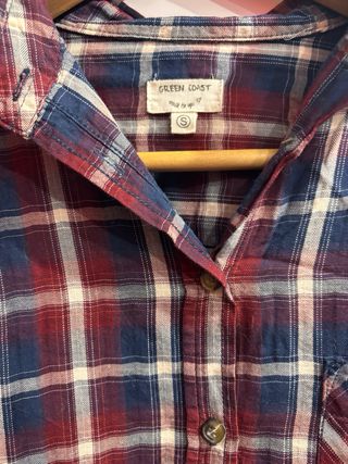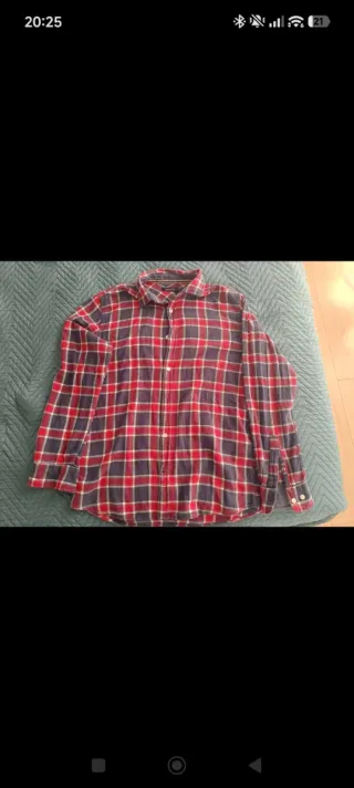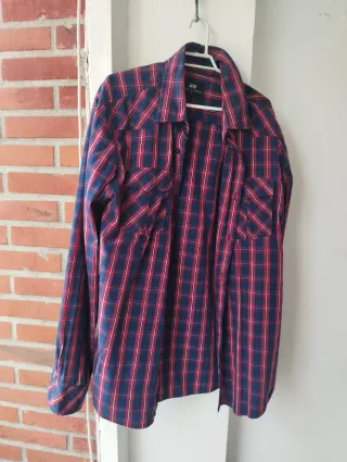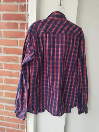 Camisa de cuadros azul marino y rojo oscuro con manga larga. - Cuadros en tonos azul y rojo. - Cierre de botones. - Tela gordita. Tiene una pequeña quemadura alante como se ve en la penúltima foto. Pero si se lleva con los botones de arriba abiertos (última foto) no se ve.