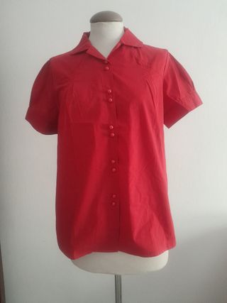 Camisa de mangas cortas roja 100 % algodón Medidas: Hombros 38 cm Sisa: 48 Cadera: 52 cm Largo: 62 cm aprox Te recomiendo que compruebes tus medidas para asegurarte de que la prenda queda como esperas (a veces las tallas pueden variar de una marca a otra) ❤