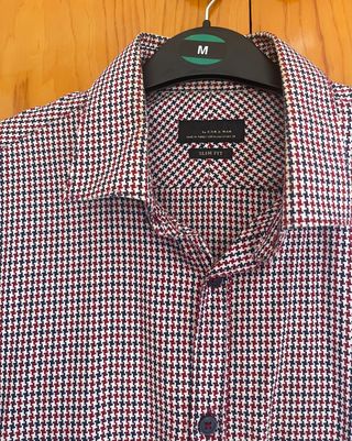 Camisa de manga larga con un diseño de cuadros pequeños en tono rojo. Poco usada, buen estado. - Cuello tipo button-down. - Un bolsillo en el pecho. - Cierre de botones.