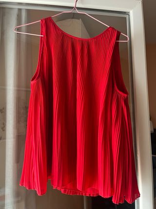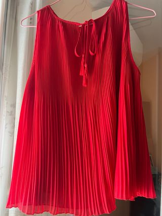 Camisa sin mangas, roja de tela plisada. con detalle de borlas para anudar en la espalda.