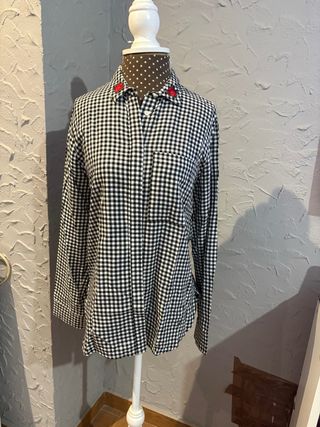 Camisa de cuadros vichy con un detalle de raya roja a lo largo de la manga. - Diseño de cuadros vichy. - Raya decorativa en color rojo. Tiene mangas al codo acampanada. Puesto en 2 ocasiones pero el bajo se abrió con el segundo lavado como se aprecia en la última foto, solo es volver a meterlo.