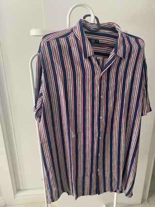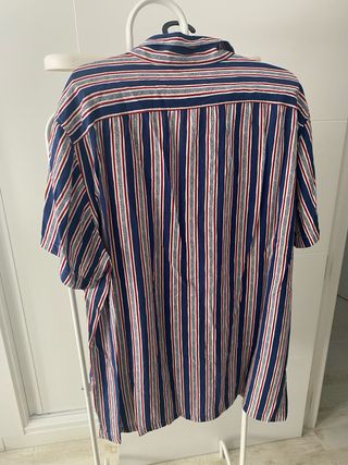 Preciosa camisa de hombre a rayas. Es de manga corta y tiene un corte clásico. - Diseño a rayas verticales en azul, rojo y blanco. - Cuello clásico. - Botones funcionales.