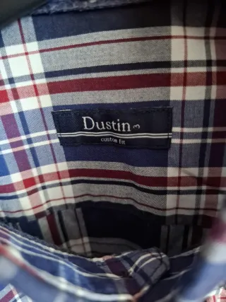 Preciosa camisa de hombre de la marca DR&N. Es de color azul, con rayas verticales y pequeños detalles rojos. - Talla: No especificada en la imagen. - Diseño elegante y moderno. - Tejido suave y de buena calidad.
