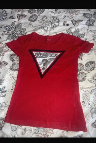 Camisa de manga corta de la marca Guess en color rojo. - Diseño con logo triangular frontal. - Detalles brillantes en el logo.