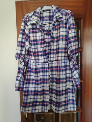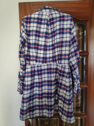 Camisa/vestido de Zara,se puede usar de camisa o de vestido,de franela calentita, color blanco con cuadros azules/negros/rojos, entallada en cintura . Tiene dos peculiaridades, doble cuello con doble pechera y manga abullonada q le dan un aire original y distinto. Sienta muy bien pero a mi me queda pequeña . Talla L, aunque yo diría q tira a pequeña, casi una M