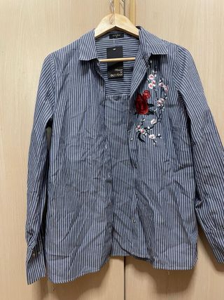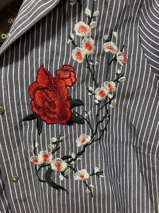 Camisa de rayas con un bonito bordado de flores y una rosa. - Diseño de rayas verticales. - Detalle de bordado floral. - Rosa roja grande. - Flores blancas pequeñas.