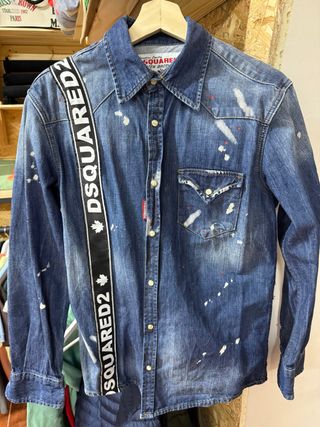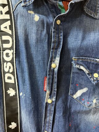 Camisa vaquera espectacular con un diseño único. - Detalle de cinta con logo DSQUARED2 en el lateral. - Efecto desgastado y salpicaduras de pintura en blanco y rojo. - Cierre de botones metálicos.