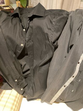 Dos camisas de hombre, corte slim fit, talla L. Una en color negro y otra en color rojo. Estan como nuevas, usada unas dos veces. Las dos por 15 euros. - Camisa negra con botones. - Camisa roja con botones.