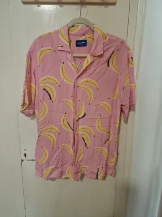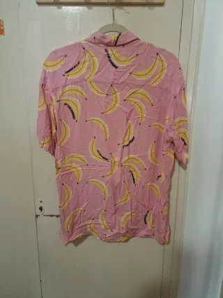 Camisa de manga corta con un divertido estampado de plátanos sobre fondo rosa. - Cuello camisero. - Cierre de botones. - Tejido ligero.