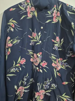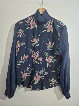 Elegante camisa con estampado floral sobre fondo azul marino. Las mangas son de un tejido vaporoso y transparente. - Cuello alto. - Cierre de botones. - Mangas largas abullonadas.