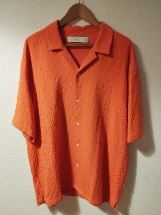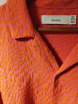 Camisa de manga corta con tejido texturizado en color naraja y rosa. Cuello camisero abierto tipo bowling. Marca: Bershka Talla: L Estado: usada en 3 ocasiones, como nueva