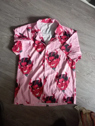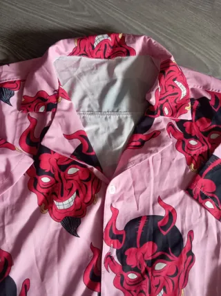 Camisa de manga corta con un llamativo estampado de demonios en tonos rojos y negros sobre fondo rosa. - se envía lavada y planchada - Diseño de cuello abierto. - Cierre de botones al frente. - Estampado repetido de caras de demonio.