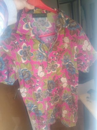 Camisa de manga corta con un vibrante estampado floral. - Diseño llamativo con flores en tonos rosas, azules y verdes. - Cuello clásico y manga corta. - Tejido ligero y cómodo.