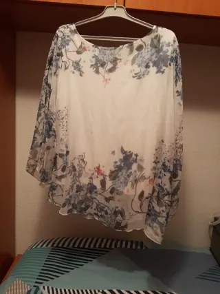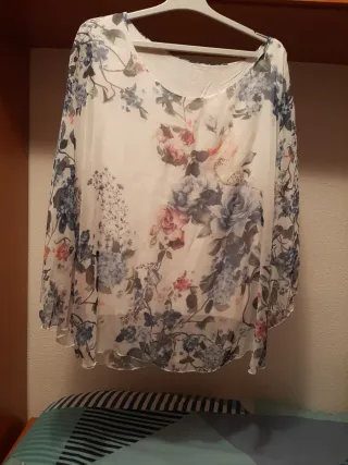 Camisa de manga larga con un bonito estampado floral. Es ligera y fluida, perfecta para añadir un toque de color a tu vestuario. - Diseño con flores en tonos azules, rosas y blancos. - Tejido vaporoso y transparente.