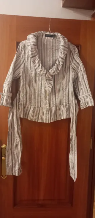 Camisa con un diseño de rayas verticales en tonos beige, gris y rosa. Presenta un cuello con volantes y mangas acampanadas. - Cierre de botones. - Detalle de volantes en el cuello y bajo. - Mangas 3/4 con volante en el puño. - Lazos largos a los lados.