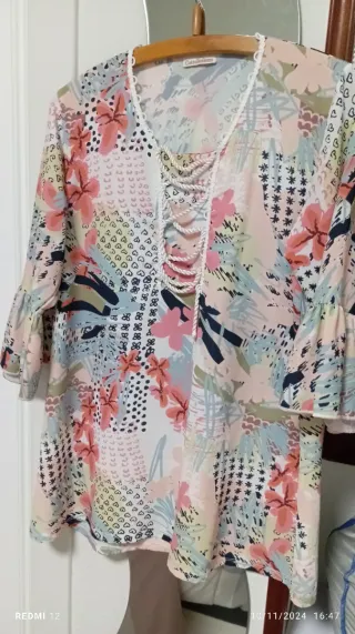 Preciosa camisa de la marca Jaase, pone talla M, pero es amplia (oversized). Como es de hombros caídos, admite varias tallas. Es una prenda alegre y vistosa. - Diseño de flores y hojas en tonos rosas, verdes y amarillos. - Cierre de botones. Ancho hasta 80 cm. Largo 75 delante Largo 82 atrás