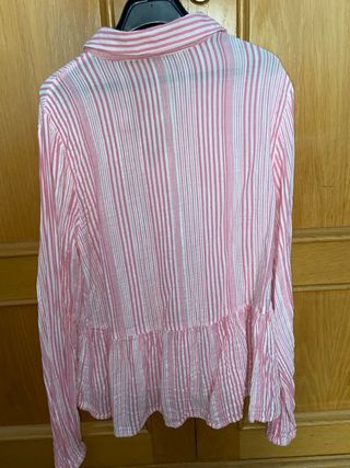 Blusa/camisa rosa con rayas finas blancas, botones delanteros, cuello pico y manga larga abullonada. Talla 42/L