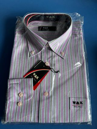 Camisa de vestir para caballero de la marca W&K. Presenta un diseño de rayas verticales finas en tonos azules rosas y blancos, con un cuello clásico abotonado. - Cuello con botones. - Diseño de rayas finas. - Nueva con etiqueta.