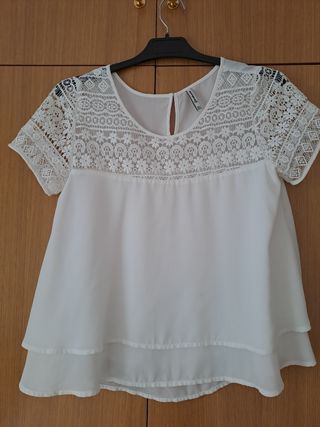 Camisa de manga larga con estampado floral. - Diseño con flores rosas y hojas azules sobre fondo blanco. - Cuello camisero y cierre de botones. - Puños con botón. Sin estrenar Pone talla S pero equivale a una M