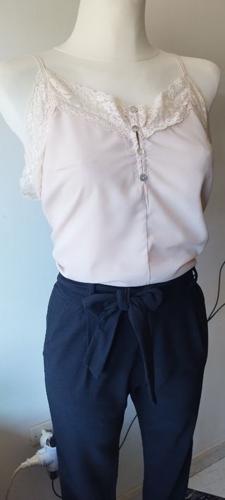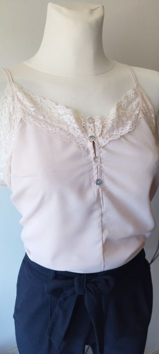 Blusa lencera en color rosa palo, con detalles de encaje botones y tirantes ajustables. Talla única, valdría para una talla M-L aproximadamente, hay medidas en las fotos