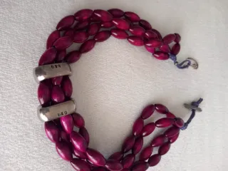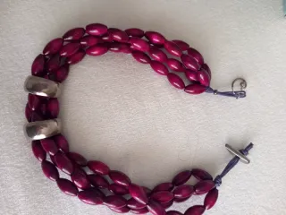 Elegante gargantilla con cuentas de madera en tono rosa vino y detalles en plata. Ideal para llevar tanto con kn vestido como con una camisa blanca o negra. - Diseño de tres hilos. - Cuentas de madera con forma ovalada. - Cierres y separadores de plata. - Cierre de cordón ajustable. B&G es una marca española de bisutería que destaca por su cuidada elaboración artesanal y el uso de materiales de alta calidad Largo: 45cm