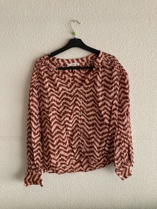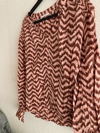 Camisa de estampado zigzag en tonos marrones y rosas. Marca Mango. - Diseño con botones delanteros. - Mangas abullonadas. - Tejido ligero y fluido.