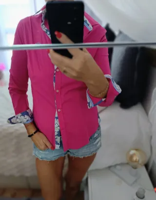 Camisa rosa chicle y blanco a rallas,preciosa a estrenar,en la segunda foto se aprecia el color exacto,tallaje de niña pero es una S.