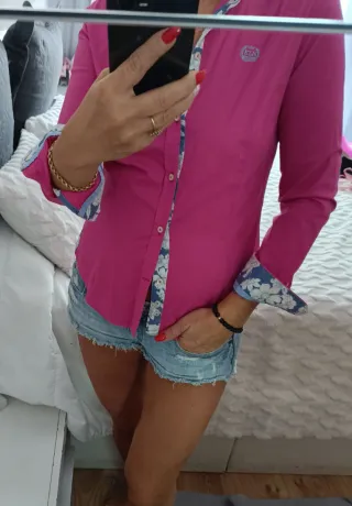Camisa de micropana con un bonito tono rosa. Es una prenda cómoda y con estilo. - Dos bolsillos en la parte delantera. - Cierre de botones. - Cuello camisero. Aunque la talla es XS, es ancha, puede valer hasta una para una M