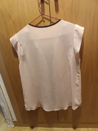 Camisa elegante de color rosa con un detalle de ribete negro en el cuello. - Diseño de manga corta. - Tejido ligero y fluido.