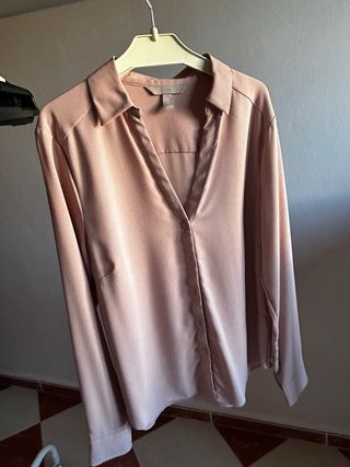 Elegante camisa de raso en color rosa, talla M. - Tejido satinado con caída. - Cuello camisero. - Cierre de botones. - Puños abotonados.