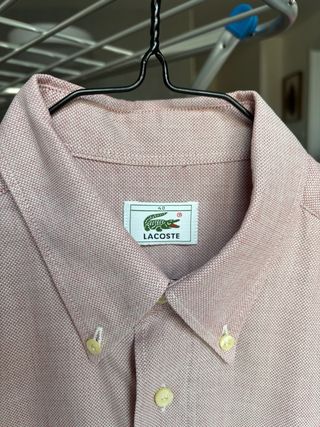 Preciosa camisa Lacoste de manga corta, en color rosa y talla 40. Es una prenda elegante y en muy buen estado. - Tejido suave y de calidad. - Diseño clásico y atemporal. - Ideal para cualquier ocasión. - Fresco y cómodo Tengo otra camisa similar en color beige talla 40 (ver en mi perfil). Cogiendo las 2, te dejo en 40€ el pack.