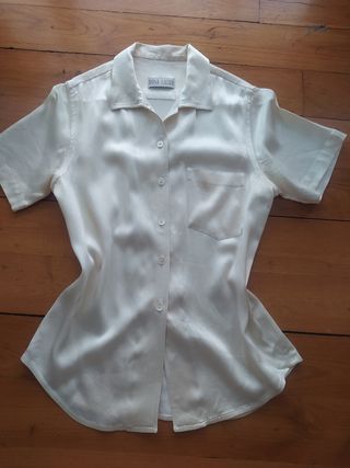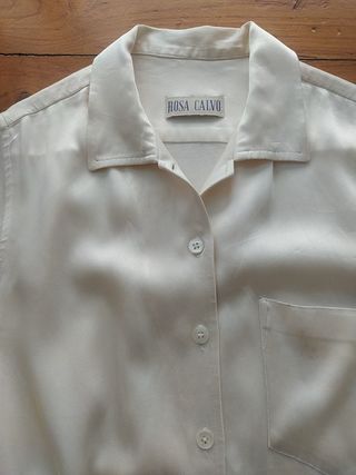 Elegante camisa de manga corta de la marca Rosa Calvo. - Color beige claro y modelo amplio. - Tejido satinado con caida. - Cuello camisero. - Cierre de botones. - Bolsillo en el pecho. Medidas de hombro a hombro 36 cm., axila a axila 47 cm. y largo 63 cm.