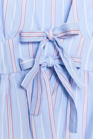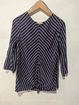 Camisa de rayas con un diseño original y femenino. - Escote pronunciado en V. - Detalle de lazadas en la parte delantera. - Mangas abullonadas. - Corte peplum. Camisa corta con cuello en V y mangas por debajo del codo. Cordones a juego. Talla L. Solo se ha usado una vez.