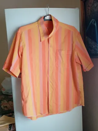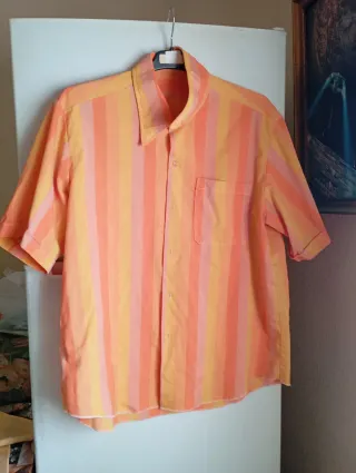 Camisa de hombre en color rosa, con detalles a rayas en el cuello y en el borde de la tapeta. Diseño elegante y moderno, perfecta para ocasiones informales o para destacar en una noche especial. Manga larga con botones en los puños, cuello clásico y cierre frontal con botones. Tejido suave y ligero, cómodo para todo el día. Talla L, corte ajustado tipo slim. Precio: 16 € EN EXCELENTE ESTADO 📦 No te hago esperar, te lo envío en menos de 24 hs. 👉 📦 SOLO ENVÍOS A TODA ESPAÑA. NO VENDO EN PERSONA.