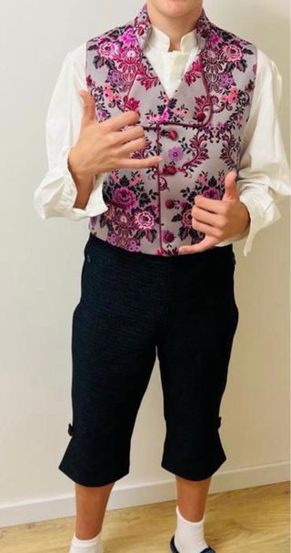 Conjunto de traje estilo saraguei con un llamativo estampado floral. - Chaleco con diseño floral en tonos rosas y grises. - Pantalón corto oscuro. - Camisa blanca de cuello alto.