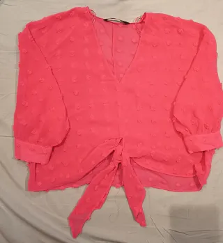 Camisa rosa semi transparente con lazada a la cintura de diseño moderno y favorecedor. Perfecta para añadir un toque de color a tu armario. Medidas. : - 64 cm de axila a axila - 50 cm de largo - 57 cm cintura -27 cm de escote V - 55 cm de manga - 11 cm de puño - Tejido ligero y vaporoso. - Detalle de textura con pequeños pompones. - Escote en pico. - Lazada frontal. - Mangas largas abullonadas con puño.
