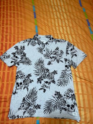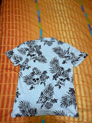Camisa de manga corta con un llamativo estampado de calaveras y rosas en contraste. - Diseño integral de calaveras y flores. - Cuello tipo polo con botones. - Tejido ligero y cómodo.