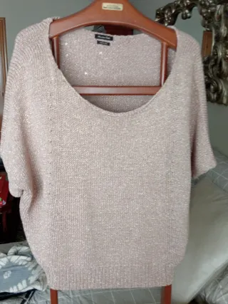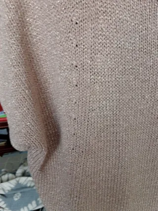 Jersey de punto con un diseño tipo murciélago y un acabado brillante que combina tonos rosas y dorados. Es una prenda versátil y elegante.Cuello para llevar solo,con camisa o camiseta debajo.Esta como nuevo - Tejido ligero y con destellos. - Manga tres cuartos. - Cuello amplio.