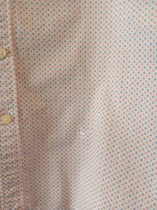 Camisa de manga larga con un diseño estampado en tonos naranja y rosa. El cuello es de tipo camisero y los puños están doblados hacia afuera. - Cuello con botones. - Estampado de micro-puntos. - Logo bordado en el pecho.