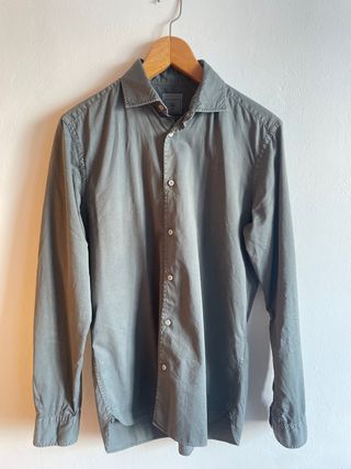 Camisa de manga larga de la marca Scalpers, usada únicamente dos días. - Talla 41. - Color verde pálido. - Cuello camisero. - Cierre de botones. - Bolsillo en el pecho.